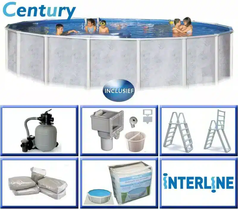 Interline Century runder Pool 7,30 m inkl. Komplettpaket: Mit dem Interline Century runden Pool 7,30 m inkl. Komplettpaket erhalten Sie einen wunderschönen Swimmingpool für Ihr Zuhause. Dieses Komplettpaket enthält alles, was Sie zum Aufbau und zur Pflege Ihres Pools benötigen. Genießen Sie den Sommer mit diesem hochwertigen und langlebigen Pool.